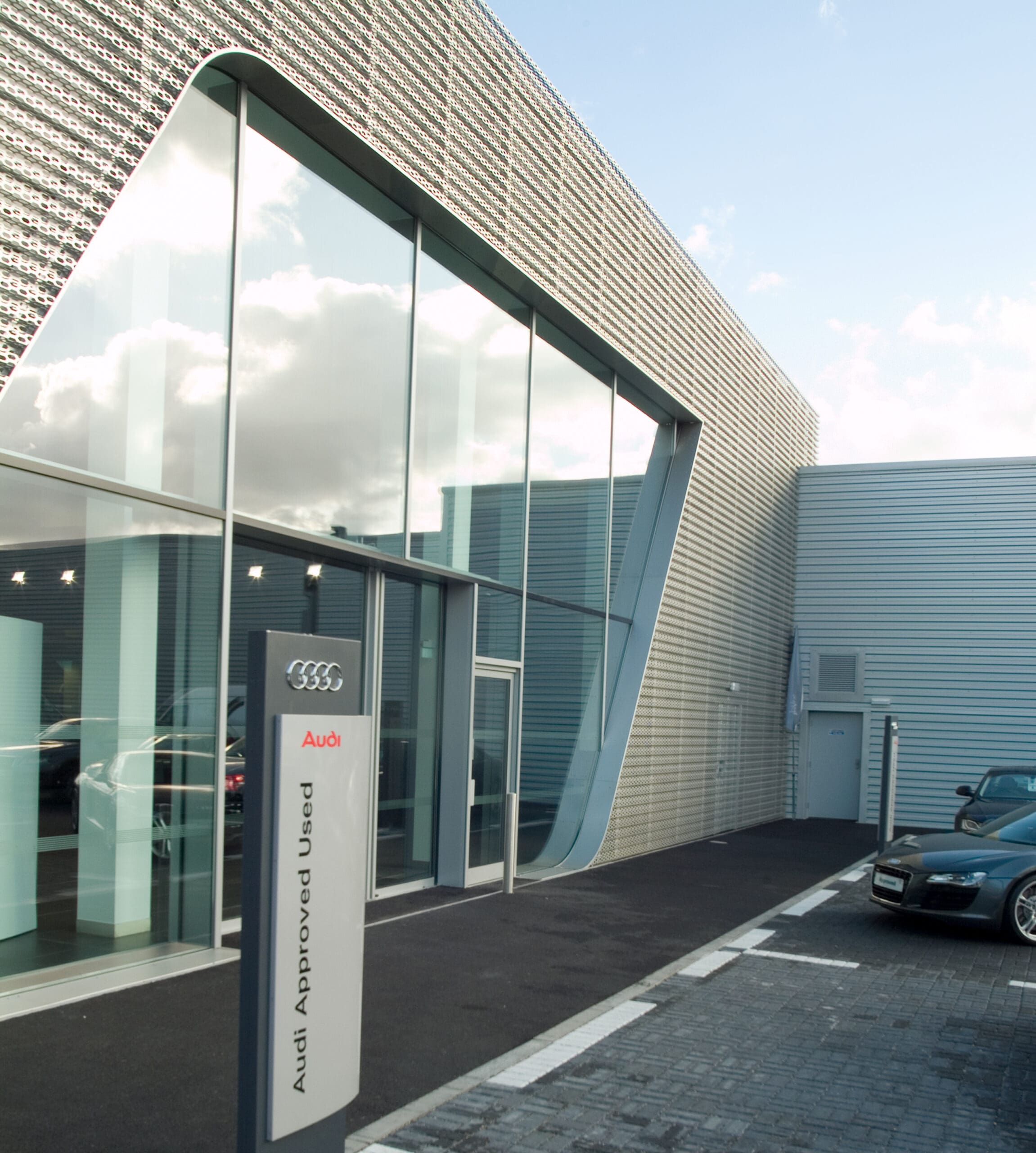 To maintain the cladding lines on this new showroom, the architect wanted the door to be overclad and ‘hidden,’ within the cladding.